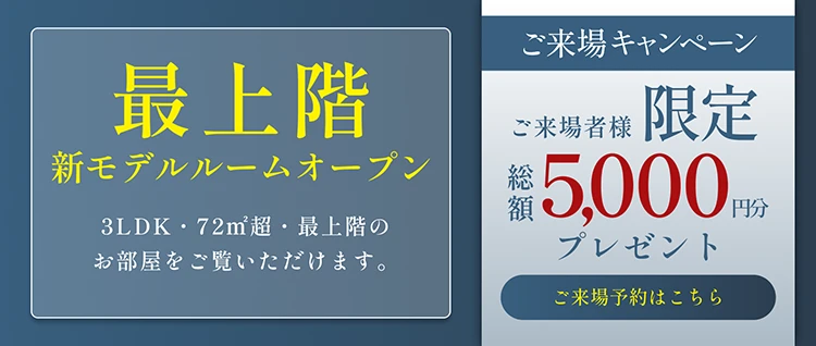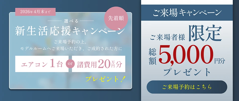 ■ご来場キャンペーン概要 ※キャンペーンは2名以上でのご来場が対象です。※ご来場いただいた方に総額5,000円分プレゼント致します。公式HP経由でご来場予約いただいた方は3,000円分、SUUMO経由でご来場予約いただいた方は3,000円分+2,000円分(※諸条件有:SUUMOのアンケートにご回答いただく必要がございます。)をプレゼント致します。※ご来場キャンペーンは、ご予約の上ご来場いただき、アンケートに必須項目をご入力いただいた⽅が対象となります。※プレゼントは、1世帯1回限りとさせていただいております。※プレゼントは限りがございますので、内容が変更となる場合もございます。他のキャンペーンと併⽤できません。予めご了承ください。※未成年者や学⽣の場合は対象外となります。※掲載の写真はすべてイメージです。キャンペーン主催:第⼀交通産業株式会社。AmazonはAmazon.com,Inc.またはその関連会社の商標です。