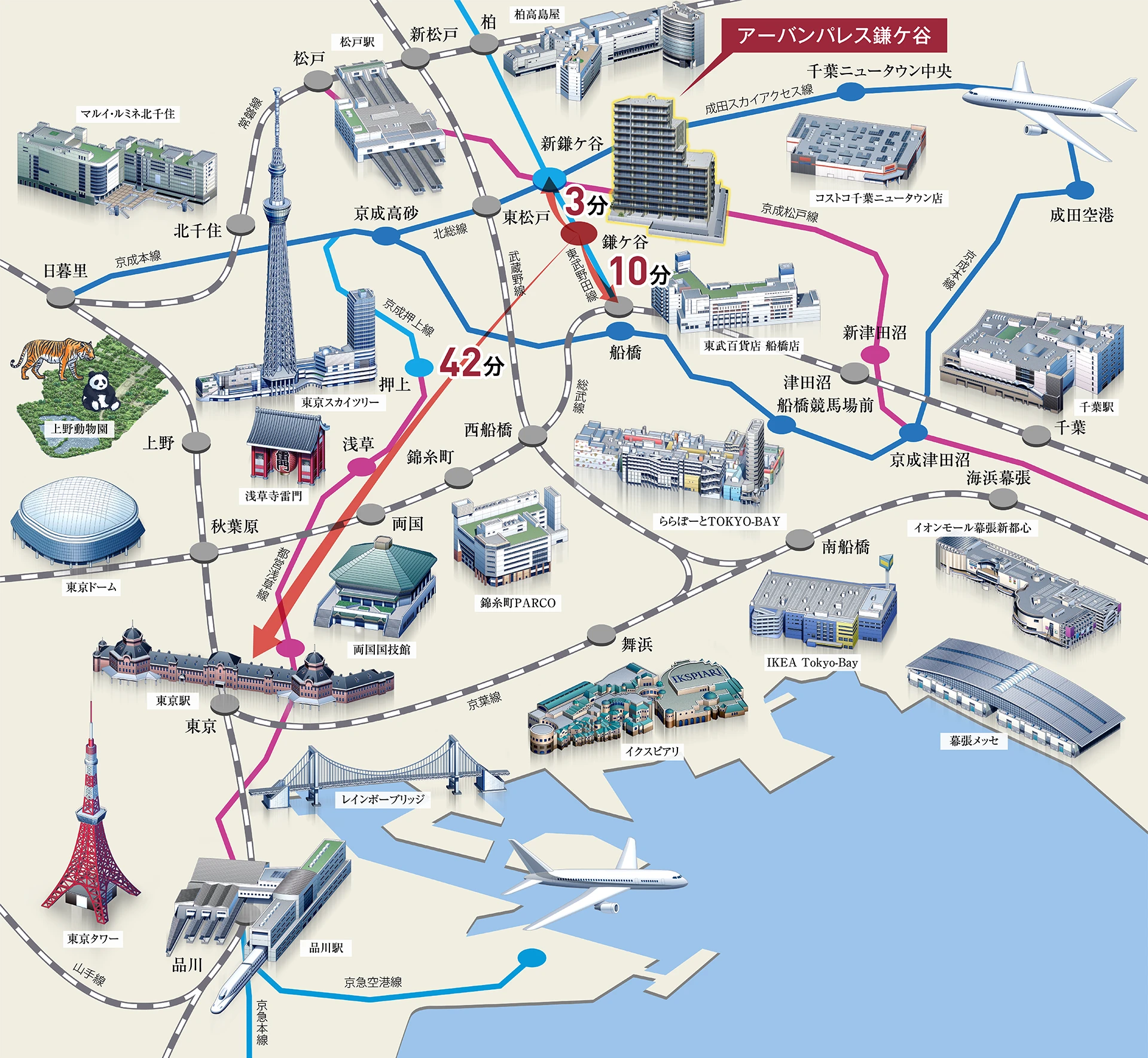 ※掲載の外観完成予想図は、現地周辺を撮影した写真(2023年12月撮影)に計画段階の図面を基に描き起こした外観完成予想図を合成したうえCG加工を施したもので実際とは異なります。なお、外観・内装の形状や色の細部、フェンス、照明、排水設備、室外機、雨樋、換気口、点検口、避難ハッチ等の設備機器、及び電線は一部表現を省略または簡略化しております。また植栽は計画段階のものであり、また特定の季節、時期、または入居時を想定して描かれたものではございません。葉の色合いや枝ぶり、樹形は想定であり、竣工時には外観完成予想図程度には成長しておりません ※掲載の「エリア最高層」とは過去15年間における「鎌ヶ谷」駅最寄のマンション分譲供給実績に基づくものです(有限会社エム・アール・シー「MIDS」による検索データです:2023年8月調べ)。※掲載の外観完成予想CGは、現地周辺を撮影した写真(2023年12⽉撮影)に計画段階の図⾯を基に描き起こした外観完成予想CGを合成したうえCG加⼯を施したもので実際とは異なります。なお、外観・内装の形状や⾊の細部、フェンス、照明、排⽔設備、室外機、⾬樋、換気⼝、点検⼝、避難ハッチ等の設備機器、及び電線は⼀部表現を省略または簡略化しております。また植栽は計画段階のものであり、変更となる場合がございます。また特定の季節、時期、または⼊居時を想定して描かれたものではございません。葉の⾊合いや枝ぶり、樹形は想定であり、竣⼯時には外観完成予想CG程度には成⻑しておりません。 ※掲載の眺望写真は現地15階相当の⾼さより2023年12⽉に撮影したものです。 ※掲載の外観写真は2025年1月・2025年4月に撮影したものに一部CG処理を施しております。 ※掲載の写真は建物内モデルルームAタイプ(901号室)を2025年4月に撮影したものです。また、家具・調度品等は販売価格に含まれておりません。 ※掲載の周辺エリア概念図は周辺の立地を概念化し表現したもので、地形・建物の大きさ・距離・方向等は実際と異なります。※「船橋」駅・「新鎌ケ谷」駅:東武アーバンパークライン各停利用、「東京」駅:東武アーバンパークライン各停利用、「船橋」駅よりJR総武線快速利用(日中平常時38分)、※上記電車による所要時間は、通勤時のもので時間帯により異なります。また、乗換、待ち時間を含みます。(「ジョルダン」(https://www.jorudan.co.jp/)時刻表の確認と乗換案内をもとに作成・通勤時=目的駅に 8:30~9:30着※ 2023年12月08日現在のダイヤによるものです。 ※1:Aタイプ(201号室)販売価格5,498万円をご購入の返済例●頭金8万円●借入金/5,490万円(月々返済4,560万円、ボーナス時返済930万円)●返済期間/50年●金利/変動金利年0.690%●月々返済額/89,883円(年12回)、ボーナス時返済/110,121円(年2回)※別途、管理費・修繕積立金等が必要となります。 ※2:Fgタイプ(105号室)販売価格5,998万円をご購入の返済例●頭金8万円●借入金/5,990万円(月々返済5,040万円、ボーナス時返済950万円)●返済期間/50年●金利/変動金利年0.690%●月々返済額/99,345円(年12回)、ボーナス時返済/112,490円(年2回)※別途、管理費・修繕積立金等が必要となります。
